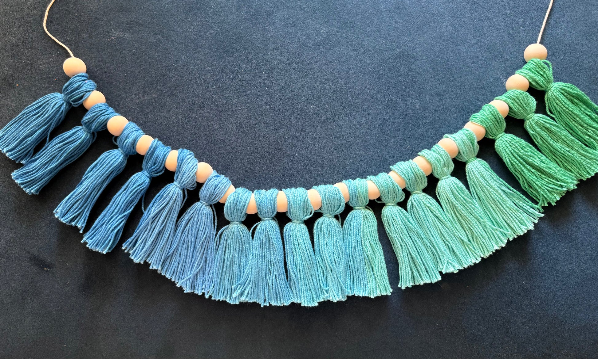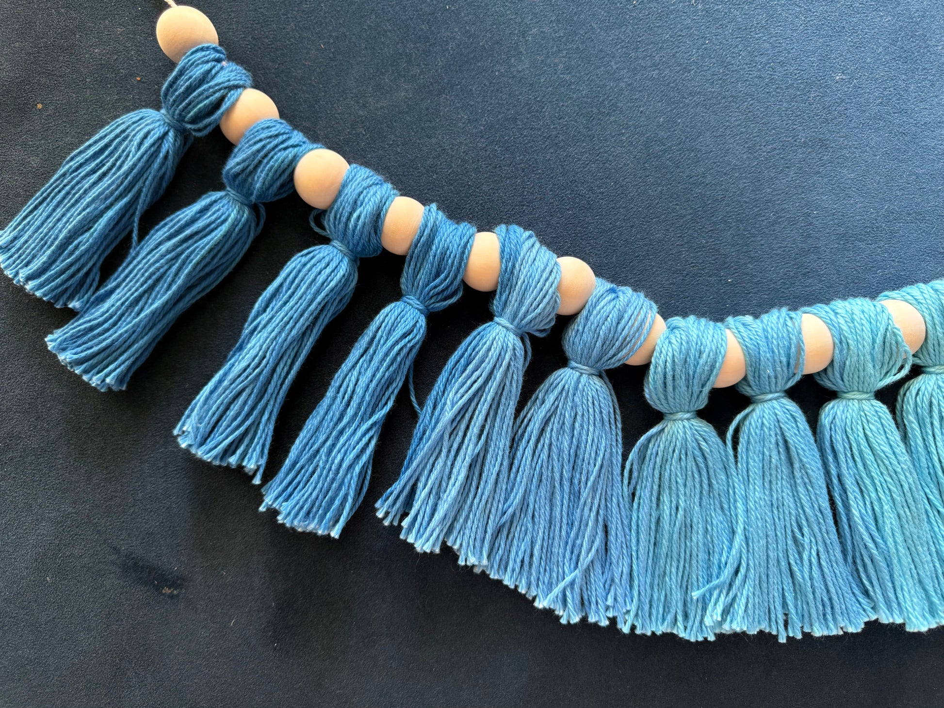 Garland of blue and green ombre tassels —a colorful and cute garland to add to any space. Garlands are around 3.5ft long on cotton twine, which can be adjusted /trimmed as needed or wanted.
