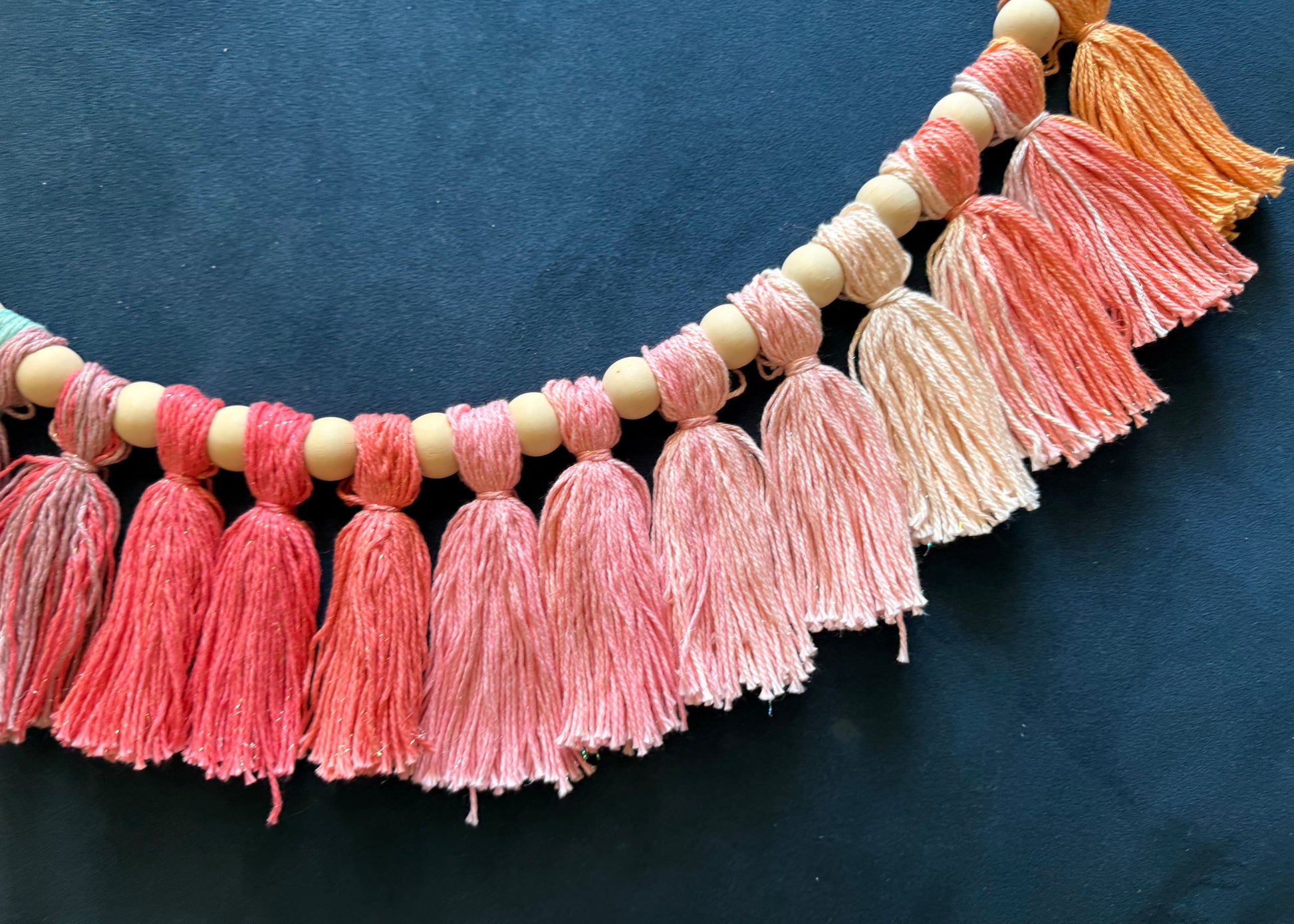 Garland of 18 tassels with sparkle thread throughout made of leftover yarn from various spools—a colorful and cute garland to add to any space. Garlands are around3.5ft long on cotton twine, which can be adjusted /trimmed as needed or wanted.