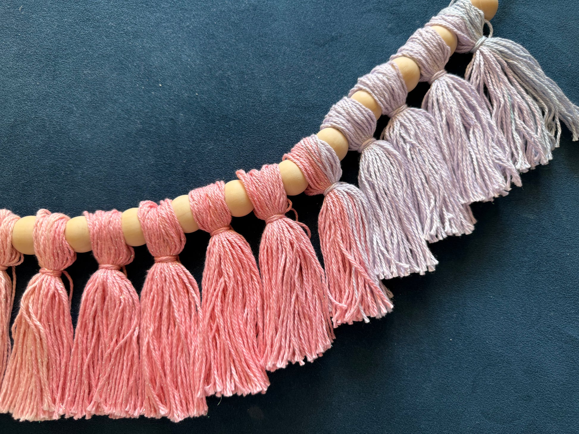 Garland of soft, pastel mermaid color tassels with a sparkle thread throughout —a colorful and cute garland to add to any space. Garlands are around 3.5ft long on cotton twine, which can be adjusted /trimmed as needed or wanted.